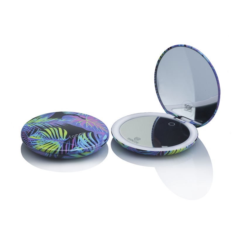 Ya no es necesario un aro de luz portátil o alumbrar tu rostro con la linterna del celular, con este espejo podrás iluminar tu rostro en donde quiera que estés. Gracias a su tamaño compacto puedes llevarlo contigo para retocar tu maquillaje con una visión detallada de tu rostro, pues su luz LED te ayudará a enfocarte en los detalles. Además, su hermoso estampado te encantará.
