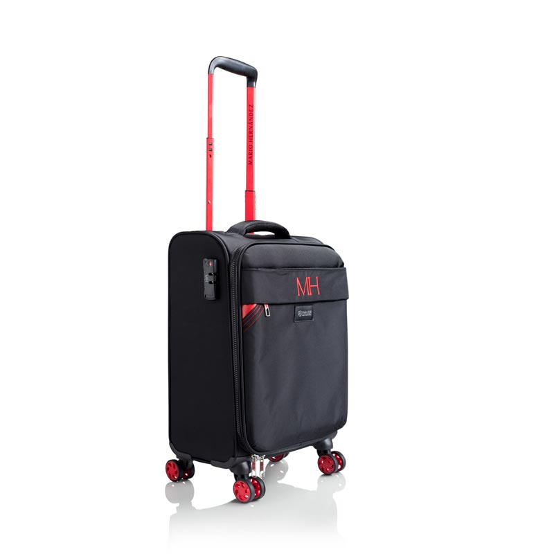 Maleta Liviana, práctica y muy funcional. Hecha en lona y de cuerpo blando en un solo color y con las iniciales MH en color contrastante, tiene ruedas que giran 360°, tres tipos de manija y cierre de cremallera con clave de seguridad.