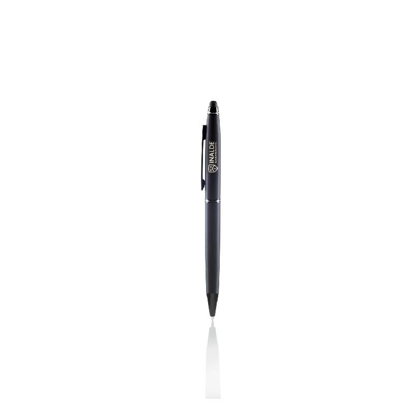 Metálico. Bolígrafo touch con apertura giratoria. Destape acero en la parte superior. Cuerpo color negro mate. Puntera y clip color negro brilloso. Tinta negra. Presentación en caja ideal para obsequiar.